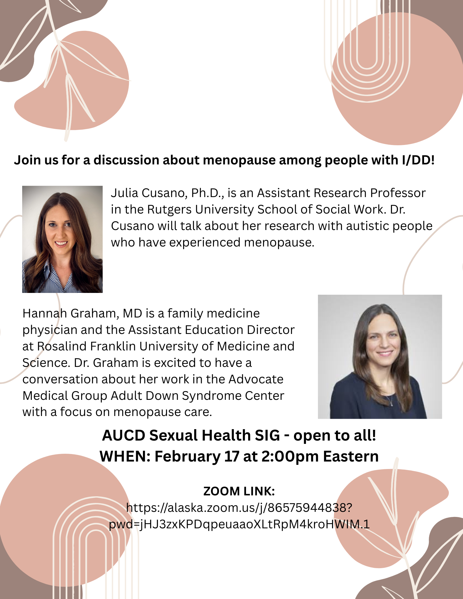 Please join the AUCD Sexual Health SIG on Tuesday, February 17 at 2:00pm ET for a conversation about menopause and developmental disabilities. Guest speakers Julia Cusano, PhD, and Hannah Graham, MD, will discuss research and practice in menopause care for autistic people and those with Down syndrome. All with an interest in talking about menopause and disability are welcome!