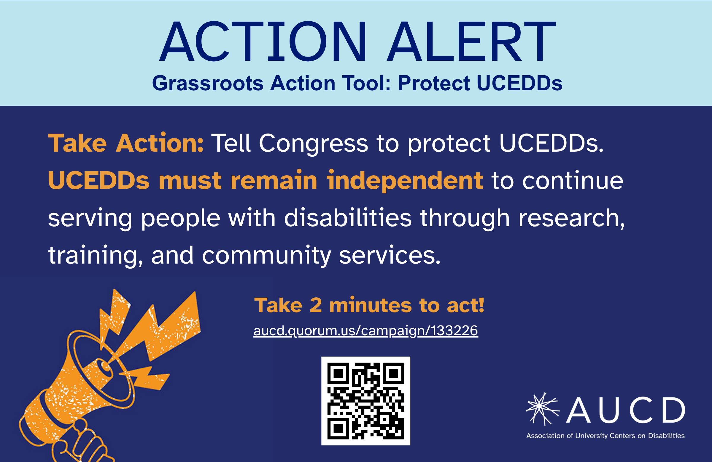 UCEDDs have been advancing disability rights for over 60 years—but now they’re at risk. The FY26 budget proposal would eliminate UCEDDs as independent programs, threatening services for people with disabilities, research and training, federal partnerships, and compliance with the DD Act. AUCD has launched an easy-to-use grassroots action tool for individuals, families, professionals, and allies to contact Congress and demand full funding for UCEDDs.
